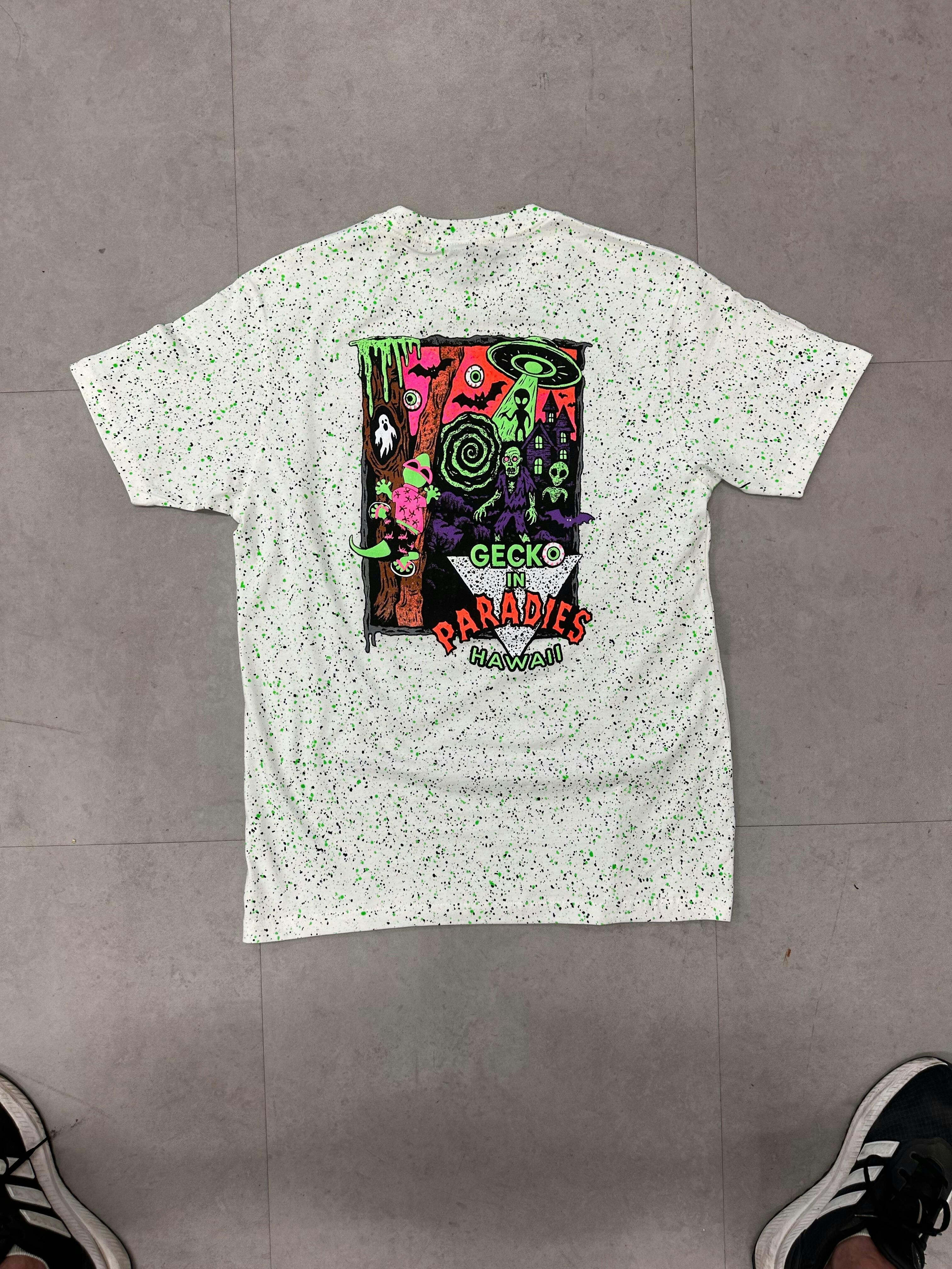 THE HAND-SPLATTERED PAINT & Puffed/Textured 1988 Retro "Space Gecko" Design on the back GLOW-IN-THE-DARK!