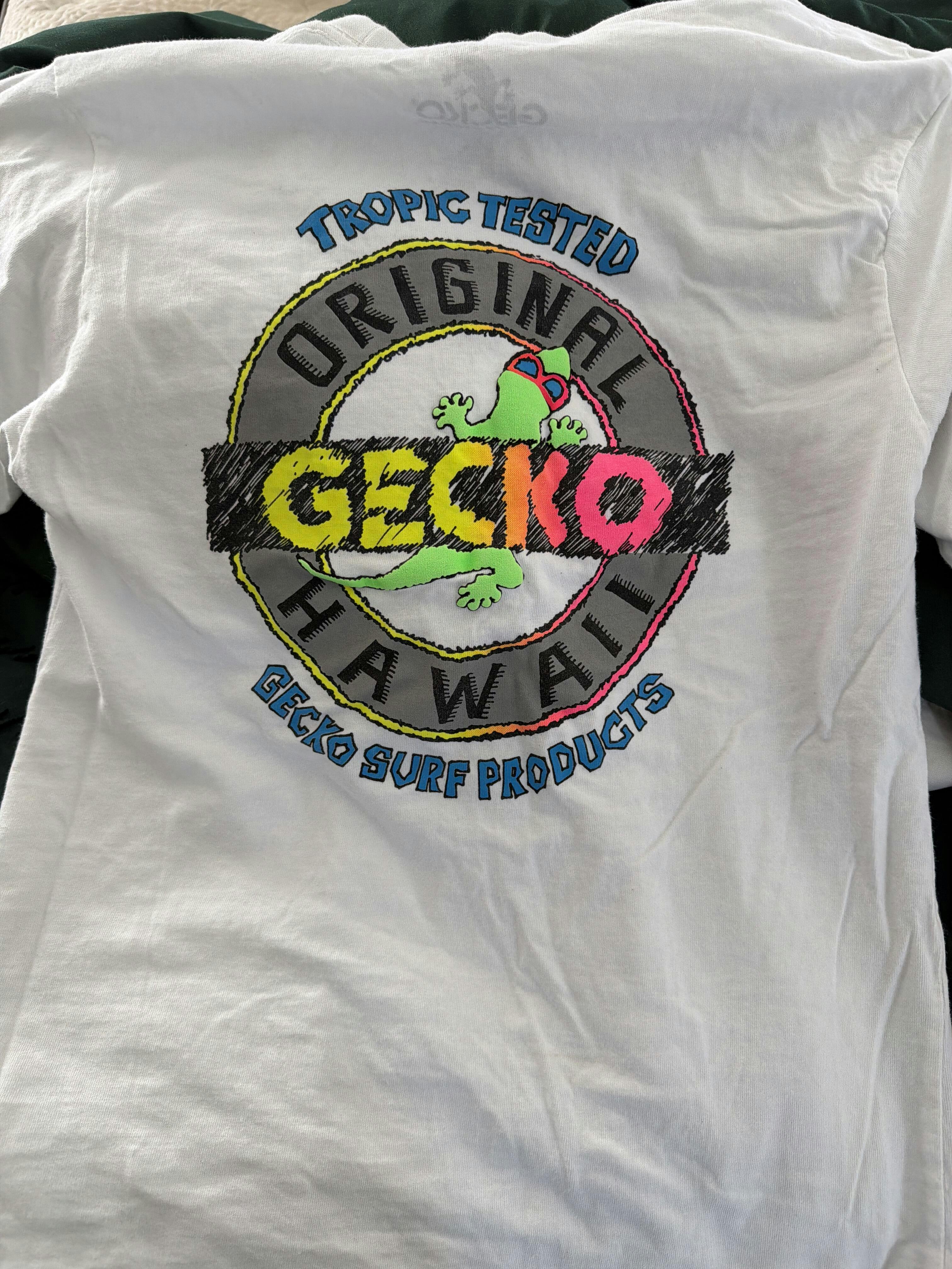 - FRONT OF TEE: Small, Reduced Size, Tropic Tested Gecko logo on upper left chest.